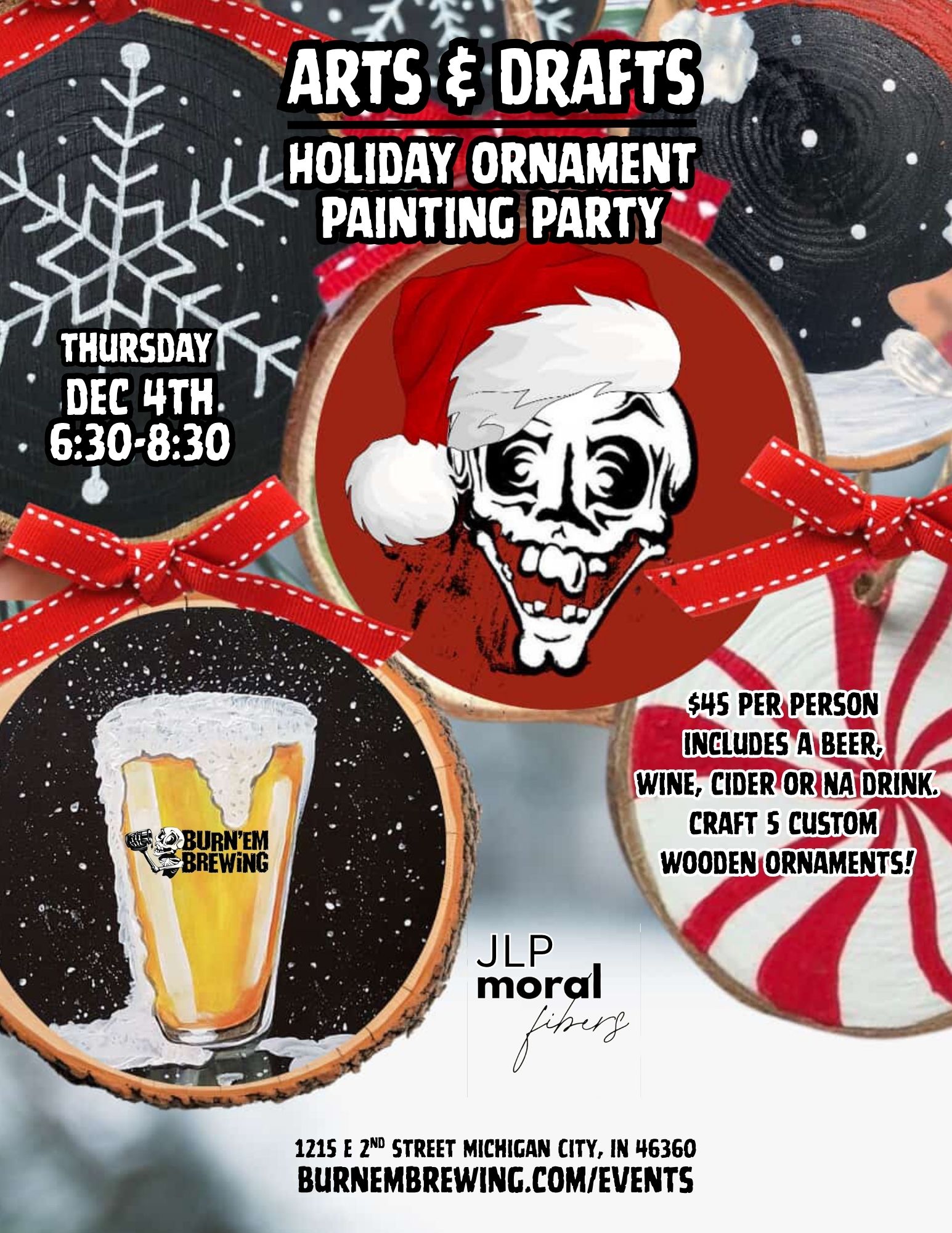Let’s gather and create! Jules of Moral Fibers by JLP is bringing ALL the supplies to let you paint + create over drinks at the brewery! We will have several samples for you to recreate, OR bring your own inspiration. You can make 5 custom ornaments to keep or give as special gifts.